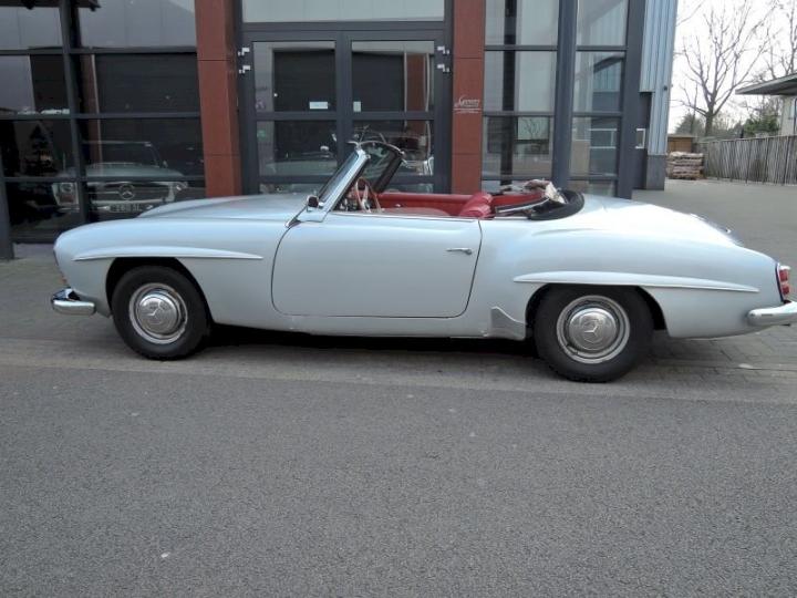Betreft een redelijk exemplaar deze late versie 190SL, een auto met een leuk uiterlijk, het lakwerk van origine donkergrijs 190G is in het verleden gewijzigd in de kleur zilver metallic 180G en is in een redelijk conditie zo ook het chroomwerk is netjes en past goed, de voorruit omranding mag vroeg of laat verchroomd worden, het rood leder interieur met passend tapijt is in een goede staat, softtop is in een goede conditie, qua body optisch goed echter o.a de vloerbodem-delen hebben aandacht nodig, nieuwe bodem delen zijn reeds aanwezig en gaan mee met de koop, technisch en motorisch loopt en rijdt deze 190SL cabriolet naar behoren, de kwetsbare Solex carburateurs zijn in het verleden vervangen in Mikuni met behoud van luchtfilter en aanzuigbuis, het motor onder blok is in het verleden vervangen door de juiste ruil motor af fabriek, het bovengedeelte met name de cilinderkop is nog origineel.